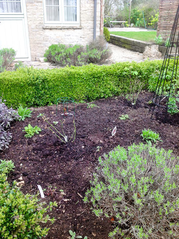 Rejuvenating a box edged border with sun-loving plants such as Roses, Clematis, Peonies, Salvias and Geraniums. We also created two gorgeous herb borders either side of the honeysuckle arch.